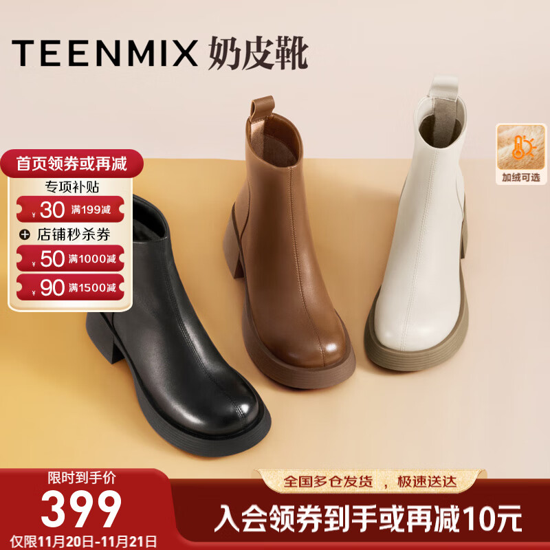 天美意女靴加绒商场同款粗跟复古潮流短靴女时装靴2025新款 黑色 37