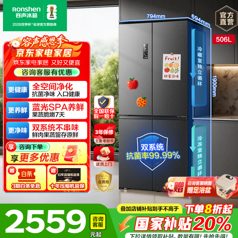 容声506升十字对开四开门双系统双循环一级能效变频风冷无霜家用冰箱干湿分储母婴超薄嵌入国家补贴20% 506升双系统循环十字门冰箱