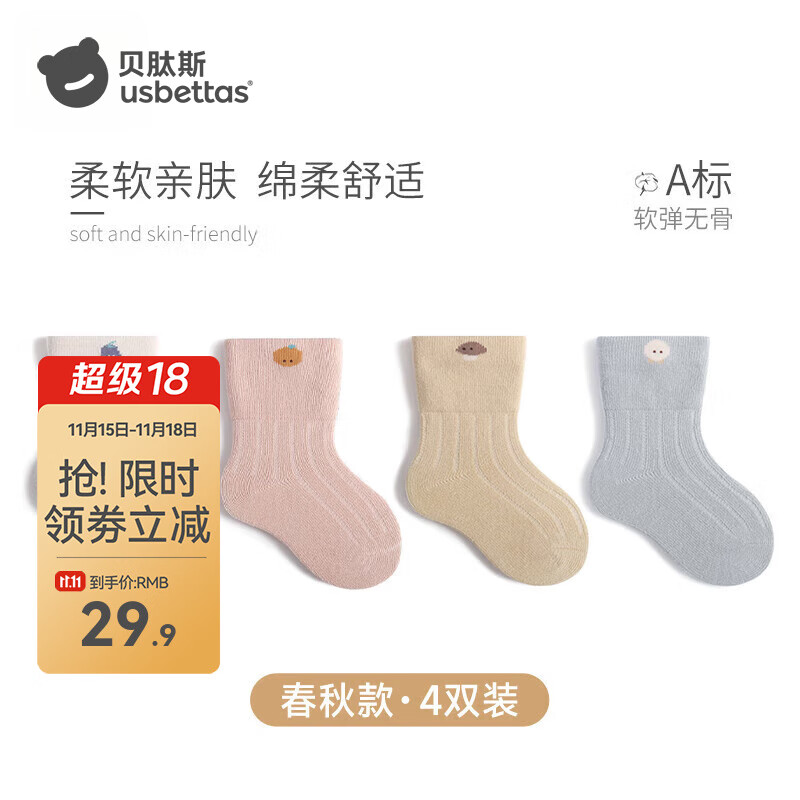 贝肽斯儿童袜子春秋季棉质新生婴儿棉袜宝宝秋冬季男童女童中筒袜精选 白色+粉色+黄色+蓝色 4双 0-6月