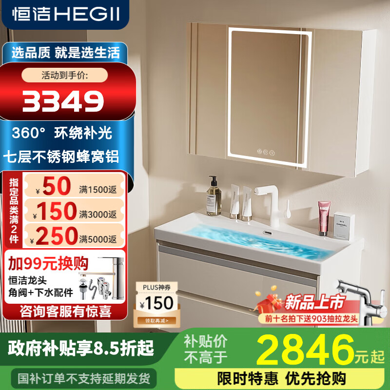 恒洁金属铝合金不锈钢浴室柜海洋盆全包背板智能360补光除雾镜柜2523J 【海洋盆+除雾+折叠镜+360补光】100CM