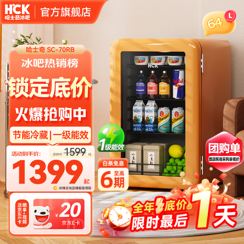 哈士奇HCK冰吧【至高补贴20%】家用小型迷你冰箱复古小冰箱玻璃门70RB酒店公寓电冰箱茶叶冷藏柜饮料柜 【莫尼橙全冷藏】64升 丨电子温控64L一级能效