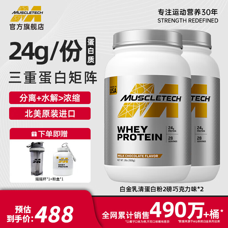 肌肉科技白金乳清蛋白粉增肌粉美国原装进口高蛋白含分离水解运动健身塑形 白金乳清2磅*2桶巧克力味【原装进口】
