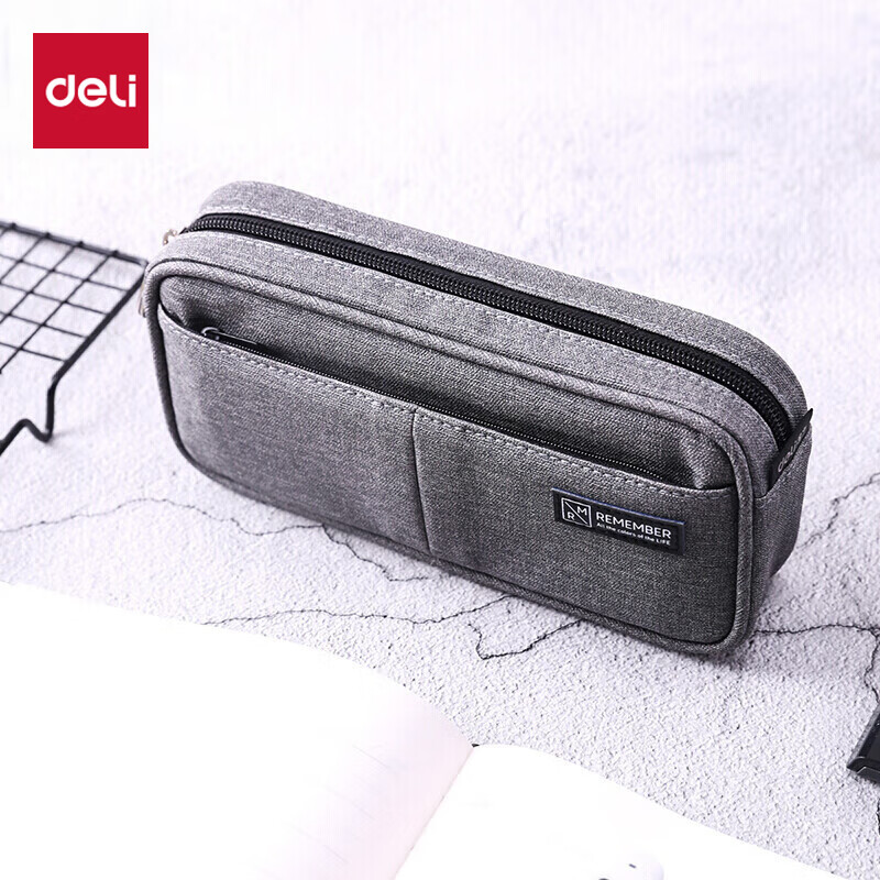 得力(deli)多层大容量笔袋 仿亚麻多功能铅笔收纳袋/商务包 学生文具盒 高级灰开学必备