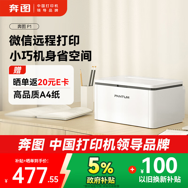 奔图(PANTUM)P1激光打印机家用 异地远程云打印 手机无线蓝牙配网 微信分享打印(P1 Lite升级远程款)