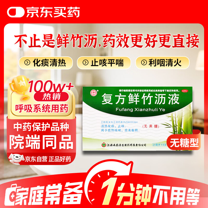 杨济生 复方鲜竹沥液(无糖) 20ml*8支 清热化痰 止咳 用于感冒引起的痰热咳嗽 痰黄粘稠感冒咳嗽