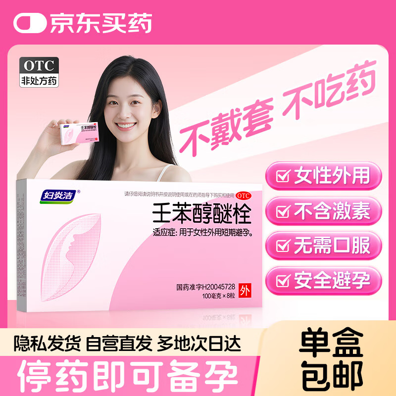 妇炎洁 壬苯醇醚栓膜凝胶8粒/盒 女性外用短期短效紧急液体避孕药栓剂避孕膜 男女性专用放阴道事后72小时不伤身避孕贴 事前非口服避孕用药 非处方药