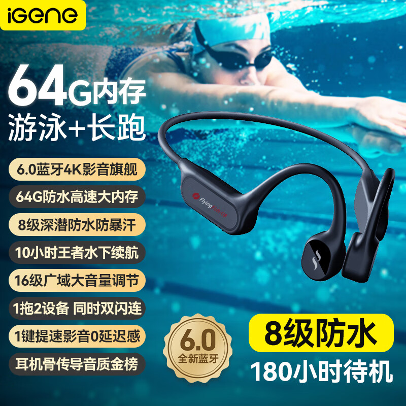 击音【8级防水+64G内存】6.0骨传导蓝牙耳机游泳运动跑步水下一体音乐MP3续航无线挂耳不入耳适用酷狗