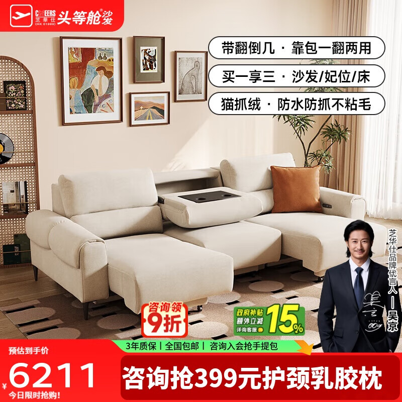 芝华仕(CHEERS)头等舱时尚电动功能奶油风猫抓绒布艺沙发床30335C白