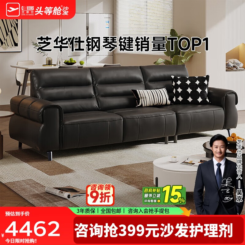 芝华仕(CHEERS)意式复古大黑牛真皮沙发客厅直排家具芝华士3177黑2.8m