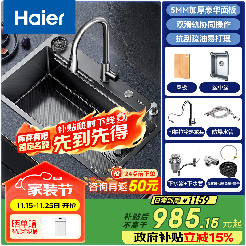 海尔(Haier)厨房水槽大单槽洗菜盆一体盆304不锈钢多功能洗碗洗菜池F05B6845B