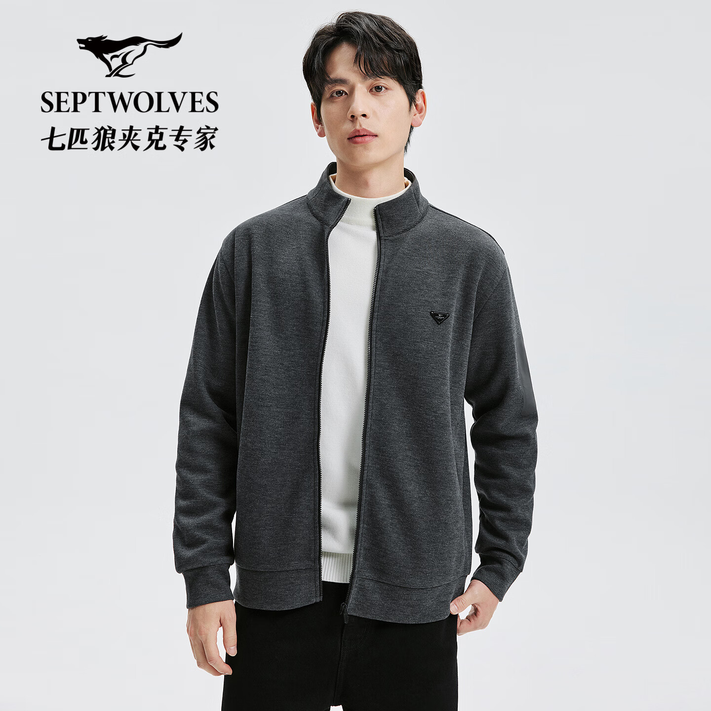 七匹狼夹克男秋冬季立领休闲上衣针织开衫卫衣百搭外套 黑灰 2XL
