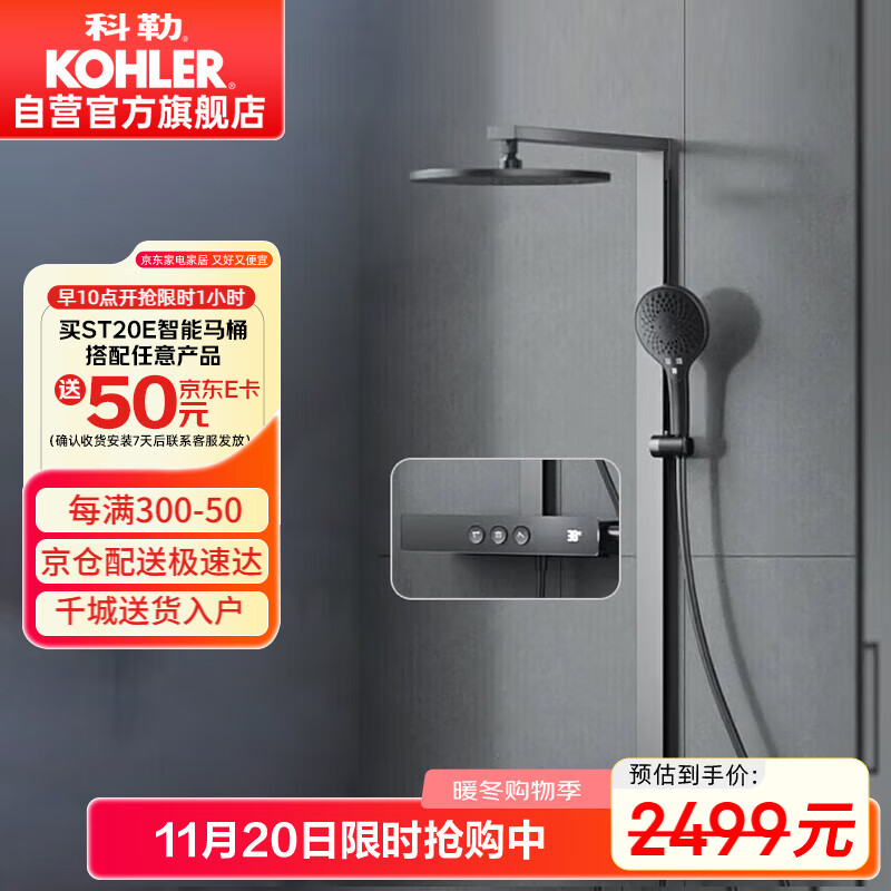 科勒(KOHLER)数显恒温淋浴花洒套装雨神37963大置物台巨幕顶喷 暮光灰按键控制