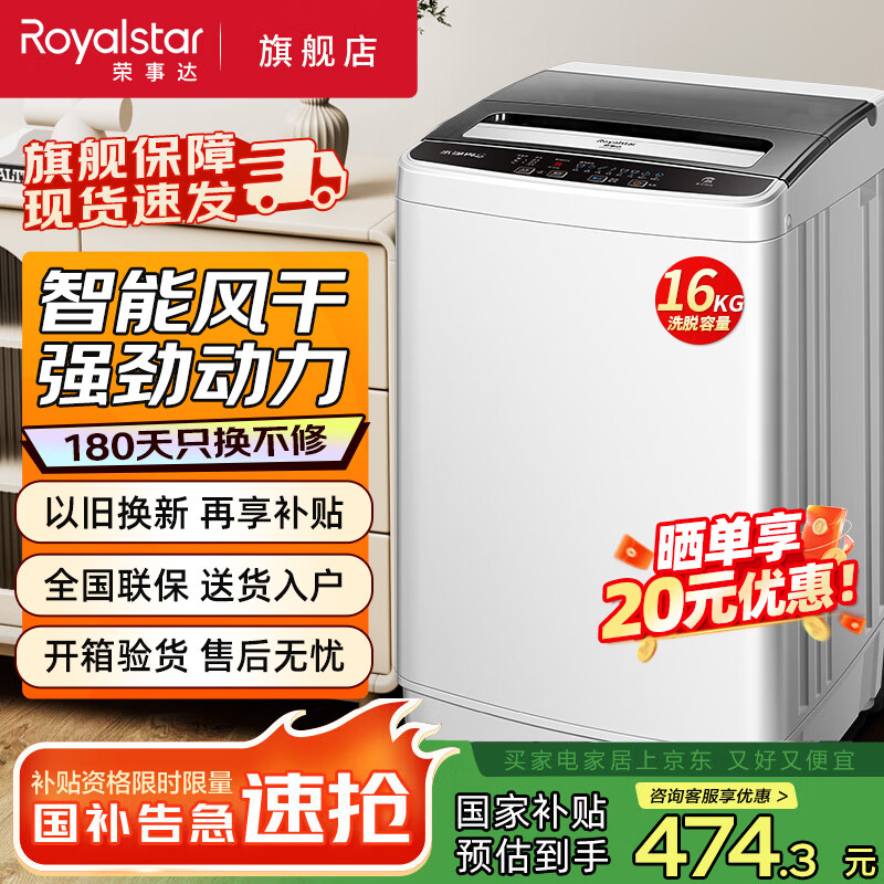 荣事达(Royalstar)全自动波轮洗衣机家用租房节能大容量一键脱水蓝光 16KG洗涤脱水容量【智能风干 强劲动力】