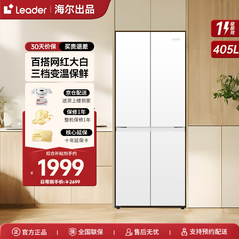 统帅冰箱 海尔出品405升四开门十字对开门白色冰箱双开门风冷无霜一级能效双变频三档变温家用电冰箱 一级双变频+三档变温+母婴空间+智能WIFI
