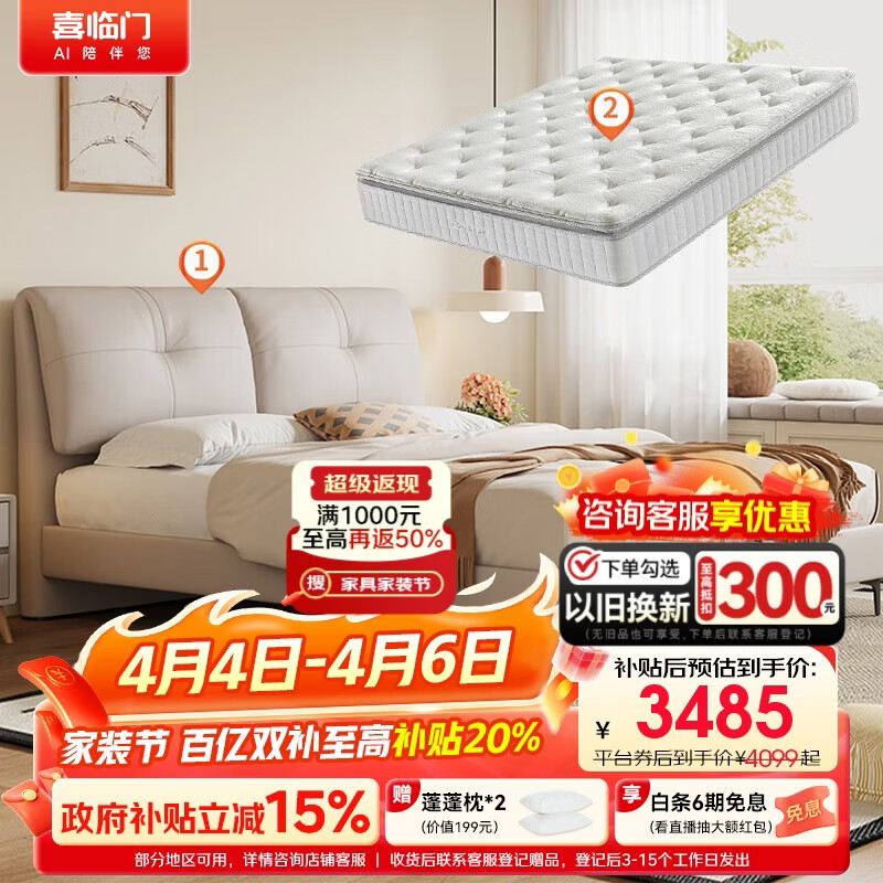 喜临门云图pro皮床+白骑士plus床垫 头层牛皮双人大婚床云雾米1.8x2米