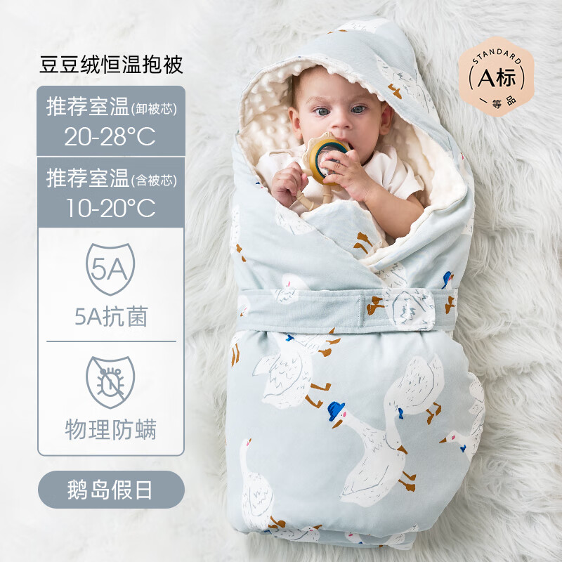 嫚熙(EMXEE)婴儿包被新生儿抱被宝宝春秋季豆豆绒包单防惊跳绑带可拆卸 鹅岛假日 90*90cm
