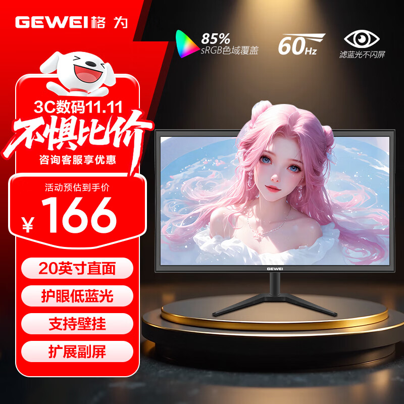 格为GEWEI20英寸显示器高清液晶屏幕HDMI接口家用办公监控可壁挂外接笔记本 20英寸直面黑【VGA+HDMI+60HZ】