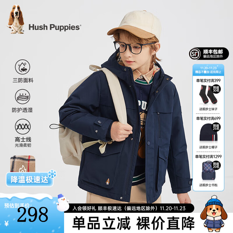 暇步士(Hush Puppies)【学院风】童装儿童男女大童冬季舒适保暖三防时尚质感厚风衣 藏蓝 140