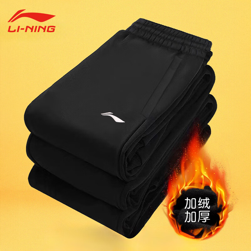 李宁(LI-NING)运动裤男2025冬加绒保暖卫裤直筒长裤束脚跑步休闲健身训练裤子 经典logo黑-加绒束脚-保暖·锁温 M