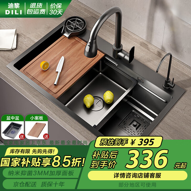 迪黎 水槽大单槽 洗菜盆一体盆 黑色纳米不锈钢厨房水池盆洗碗槽