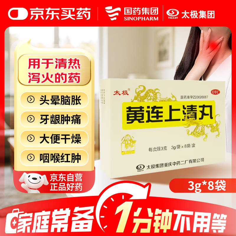 太极黄连上清丸3g*8袋/盒 清热通便 散风止痛 头晕脑胀 牙龈肿痛 口舌生疮 咽喉红肿 耳痛耳鸣 大便干燥