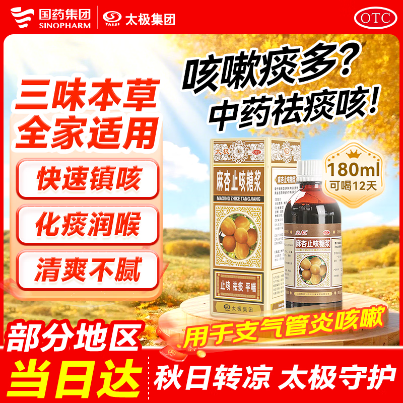 太极【官方正品】太极 麻杏止咳糖浆180ml/瓶 止咳化痰祛痰平喘宣肺润肺止咳药嗓子干痒咳嗽强力止咳