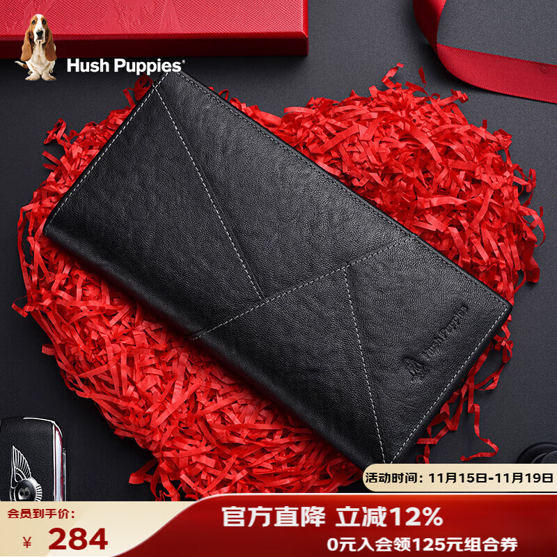 暇步士(Hush Puppies)男士钱包头层牛皮时尚长款钱夹多卡位多功能钱包生日礼物红礼盒