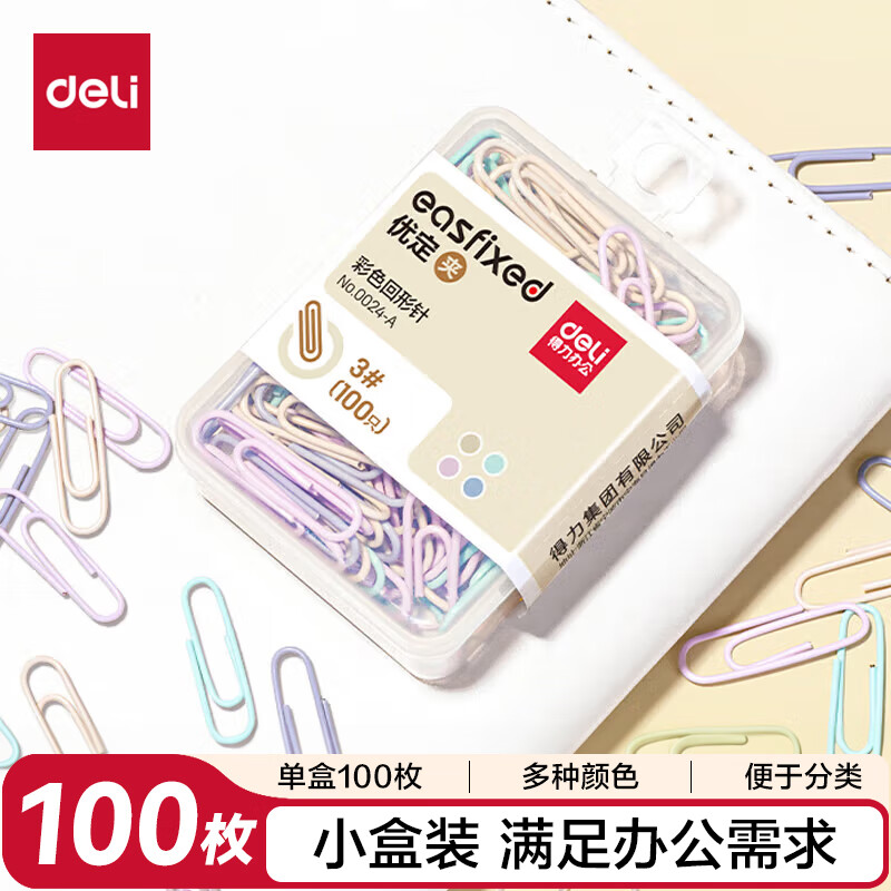 得力(deli)29mm莫兰迪彩色回形针 3#金属曲别针 办公室文具用品 资料收纳整理用品 100枚/盒 0024-A