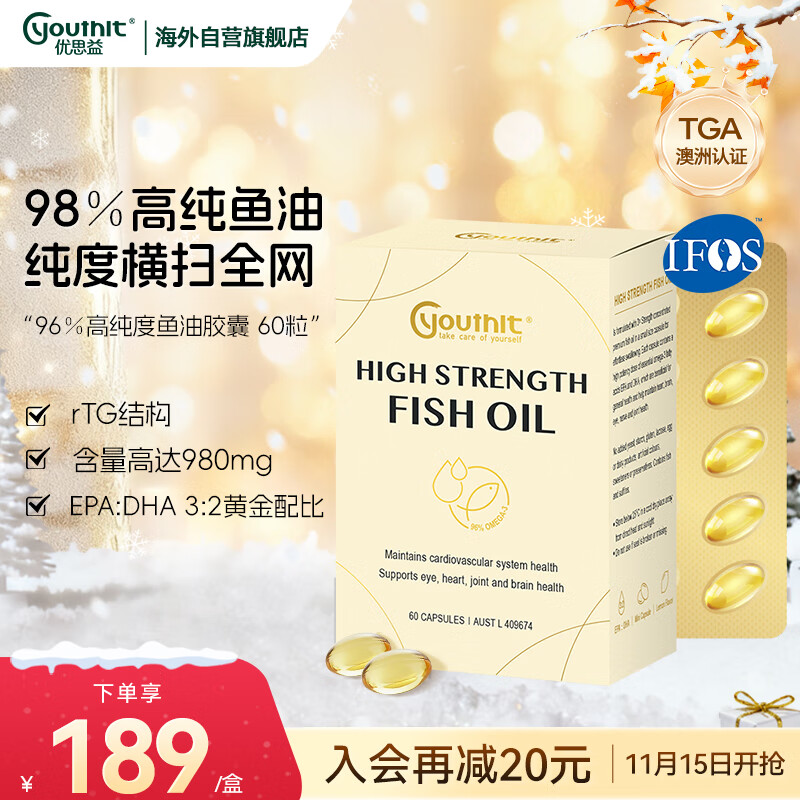 优思益youthit鱼油96%高纯度软胶囊 青少年成人 omega-3心脑眼 60粒/盒