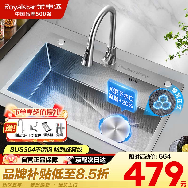 荣事达(Royalstar)水槽大单槽厨房304不锈钢蜂窝压纹洗菜盆一体盆台下洗碗槽E2