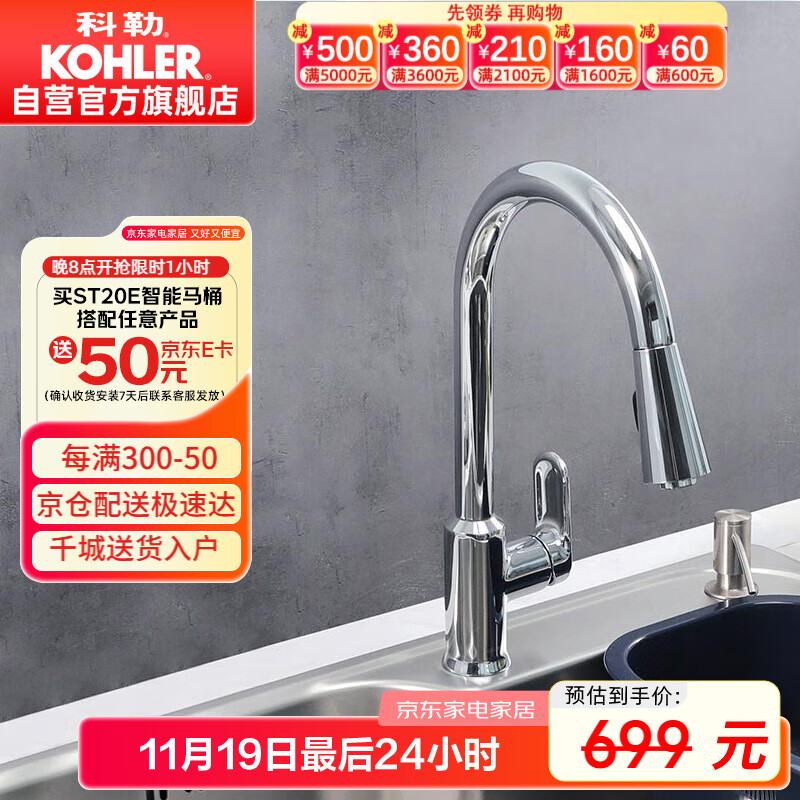 科勒(KOHLER)厨房龙头冷热双控洗菜盆龙头高抛抽拉式龙头铜合金龙头韬立24339T