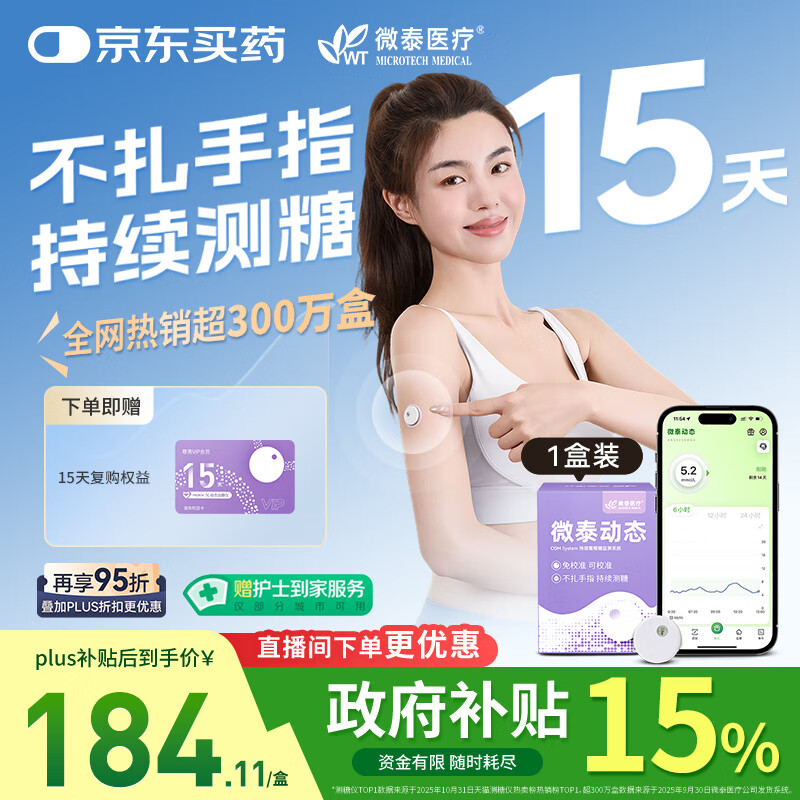 微泰动态血糖仪二代家用15天免扫描持续葡萄糖监测系统GX-01S*1盒