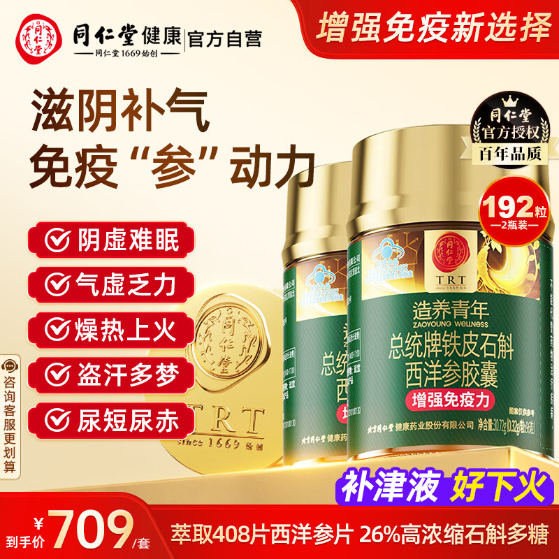 同仁堂铁皮石斛西洋参胶囊花旗参增强免疫力清火滋阴补气补津液润肺*2瓶