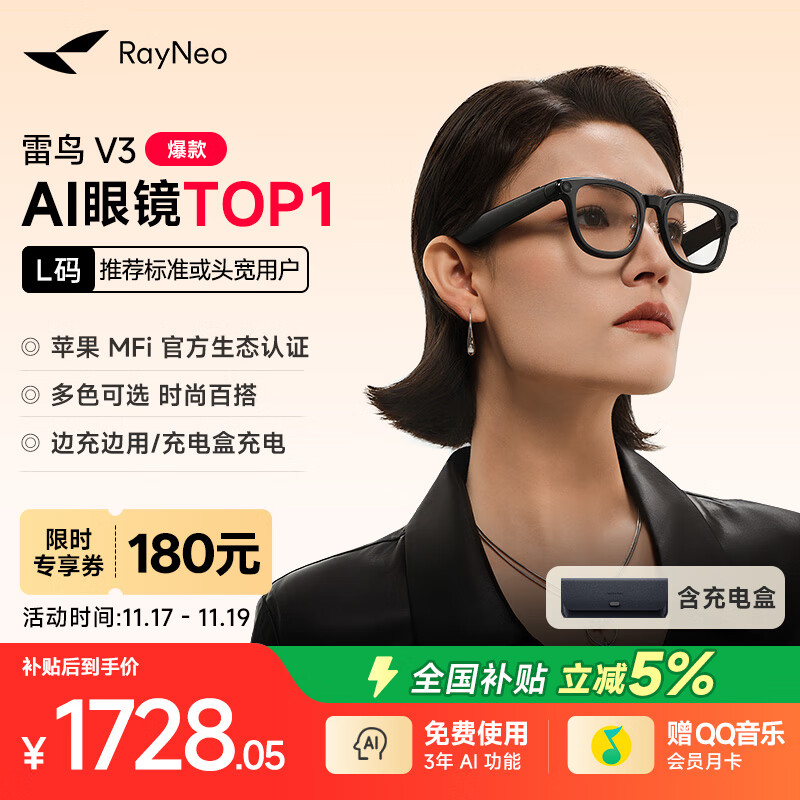 雷鸟V3【AI眼镜榜TOP1】 AI拍摄眼镜 无线智能眼镜 拍照翻译眼镜 镜架款非平光镜 羽黑+充电盒款