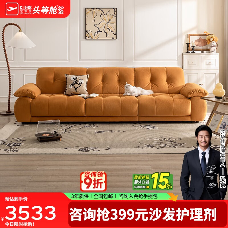 芝华仕(CHEERS)棉花糖法式复古猫抓布艺沙发中大户型客厅直排沙发2151棕2.67m