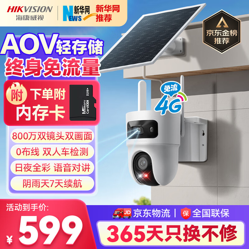 HIKVISION海康威视太阳能摄像头免插电800万双摄家用室外4G终身免流量360度无死角AOV户外监控器手机远程T4