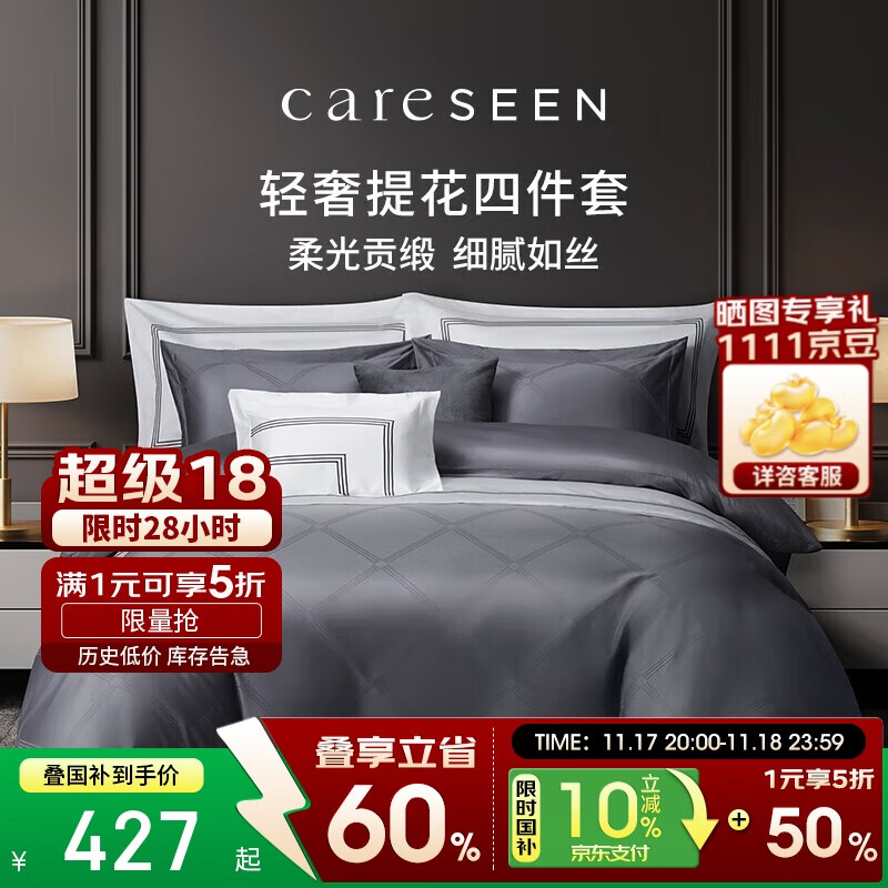 康尔馨床单四件套纯棉A类60支床单被套轻奢高级感全棉酒店床上用品 砾石灰 1.8米