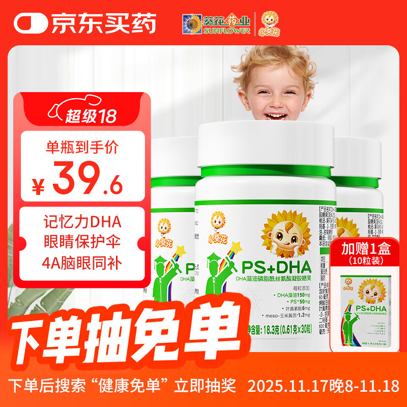 小葵花DHA藻油儿童3-12岁30粒*3瓶磷脂酰丝氨酸凝胶糖果神经酸脑营养品