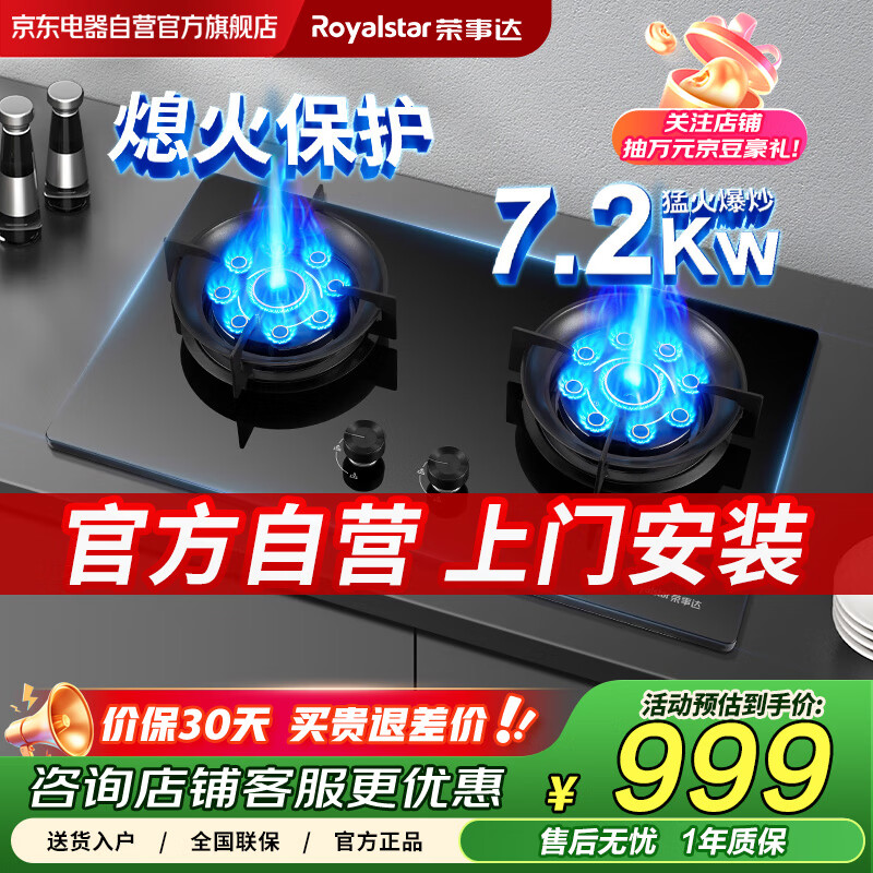 荣事达猛火燃气灶天然气煤气灶双灶7.2kw九头直喷大火力玻璃铜盖灶台嵌两用猛火灶具 SZCT7.2/14.4-B12