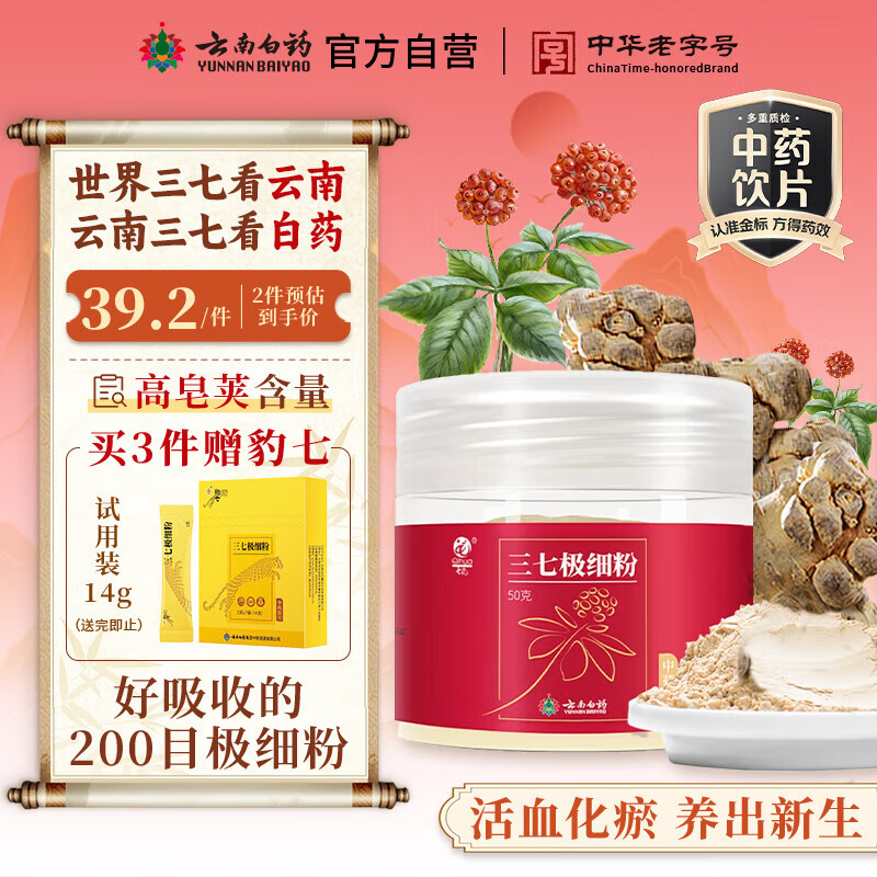 云南白药三七极细粉50g 文山道地中老年日常保健粉 外伤出血散瘀止血 消肿定痛 心脑血管养护三高调理搭蜂蜜