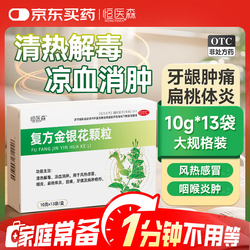 [大规格更优惠]恒医森 复方金银花颗粒 10g*13袋/盒 清热解毒 咽炎 扁桃体发炎 喉咙痛咽喉肿痛 降火去火排毒 牙龈肿痛 清火治上火 牙痛牙疼 咽喉炎嗓子疼下火