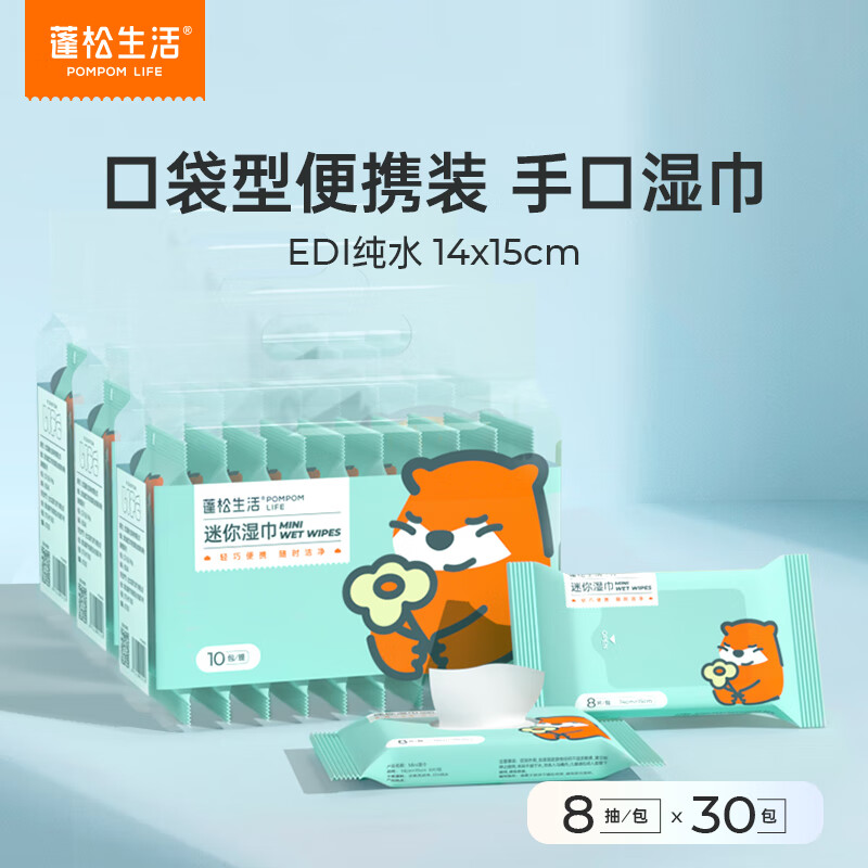 蓬松生活婴儿湿巾便携随身装婴幼儿新生儿宝宝手口出行口袋学生湿纸巾小包 迷你湿巾 8抽 30包 3提