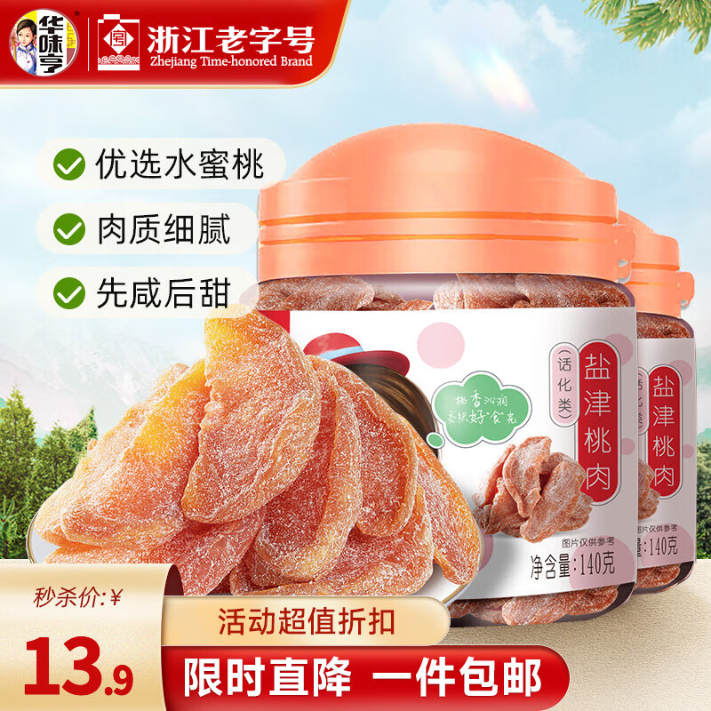 华味亨 140g盐津桃肉 桃干水果干 休闲零食小吃桃条 140g盐津桃肉*2罐