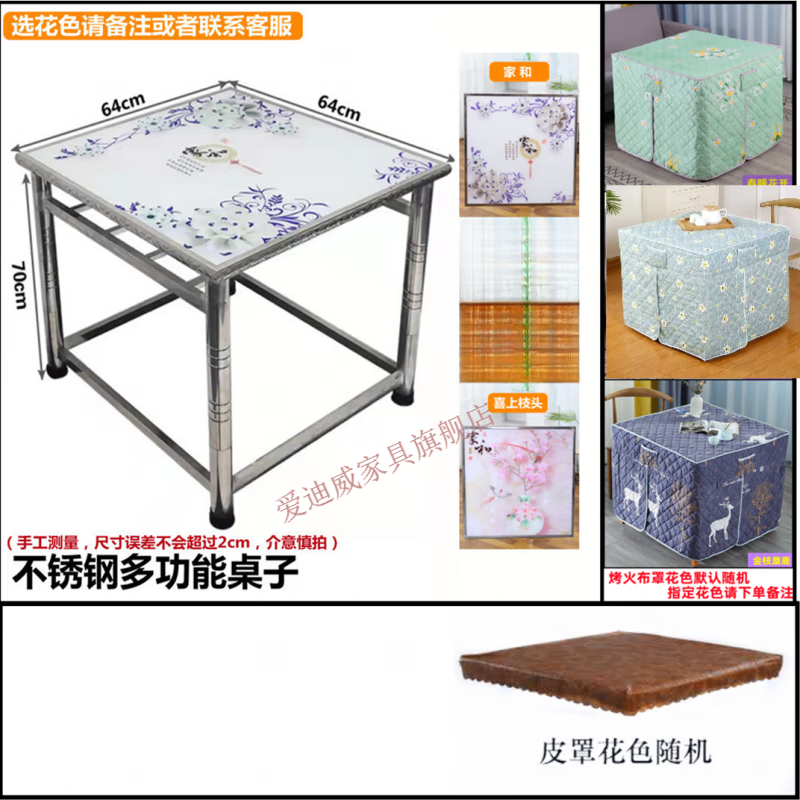 爱迪威不锈钢烤火桌子家用组装多功能取暖棋牌吃饭可折叠餐桌加厚正方形 【单杠】65桌子+布罩+皮罩 花色