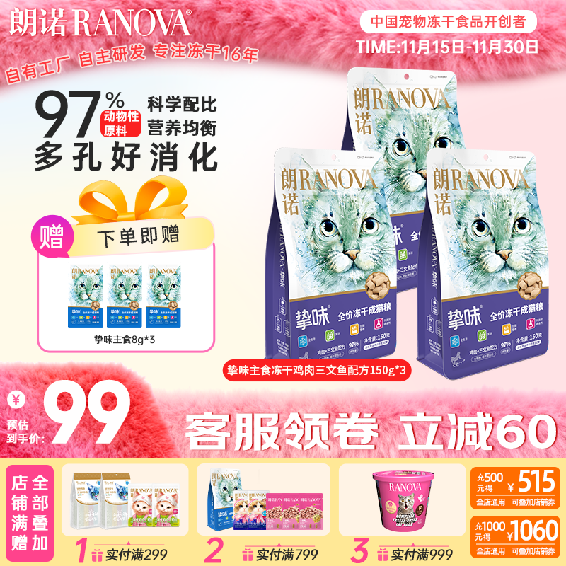 朗诺(RANOVA)朗诺冻干主粮150g猫粮冻干生骨肉主食冻干 鸡三文鱼150g*3袋 成猫