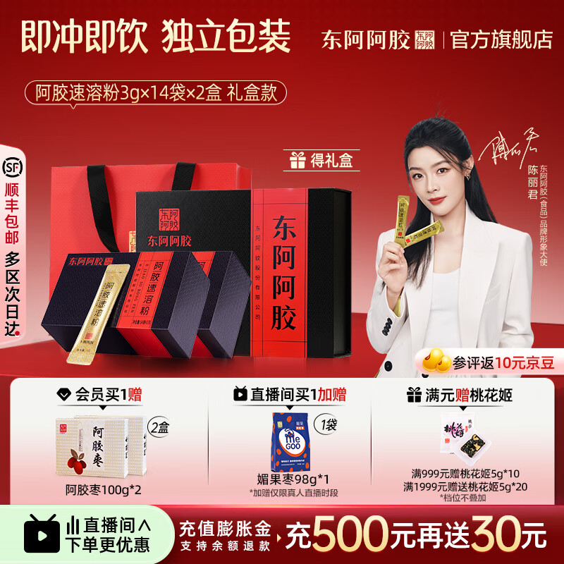 东阿阿胶官方店【陈丽君同款】阿胶速溶粉礼袋装 小金条 营养品 礼物礼品 【直播套餐】阿胶粉3g*14袋*2常规礼盒装