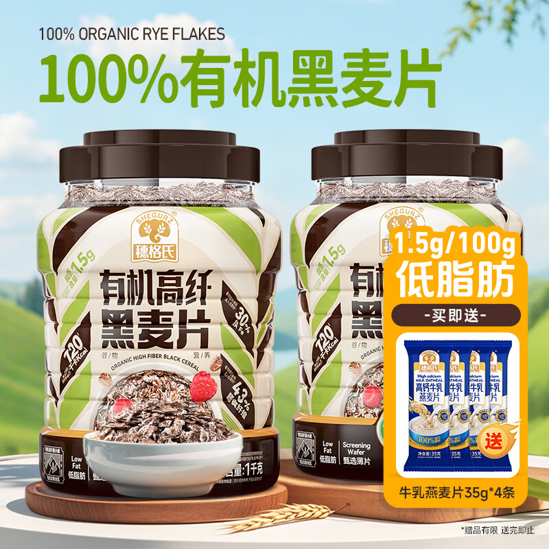 穗格氏即食有机纯燕麦片 无添加蔗糖免煮营养早餐冲饮谷物代餐 【赠试吃装】有机黑麦片 1kg*2罐