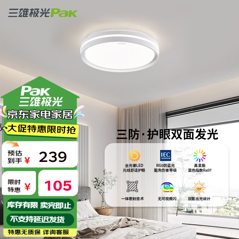 三雄极光led吸顶灯大尺寸客厅餐厅灯简约几何灯具双层透光卧室灯 24W 13㎡内适用 1248lm 护眼壁控