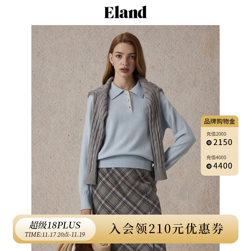 ELAND【100%绵羊毛】衣恋毛衣女纯色翻领甜美柔软上衣2025冬季新 浅蓝色(51)L/Blue M /165