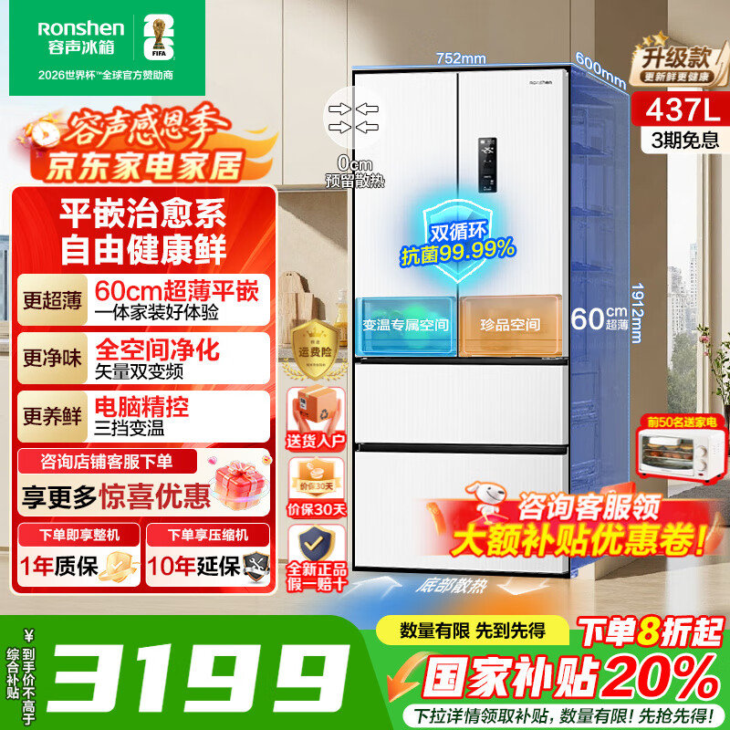 容声【国家补贴】437升法式多门四开门家用冰箱超薄零嵌入式一级能效双变频风冷无霜节能白色以旧换新 60CM法式零嵌入 BCD-437WD3MPQ白